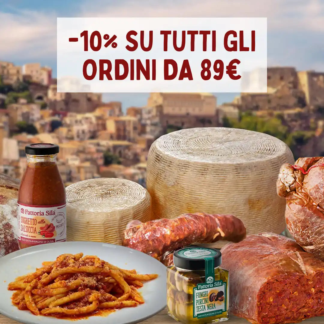 Riempi il carrello di specialità calabresi: quando superi 89€, lo sconto del 10% si applica in automatico al checkout. Nessun codice da inserire, solo gusto e convenienza!